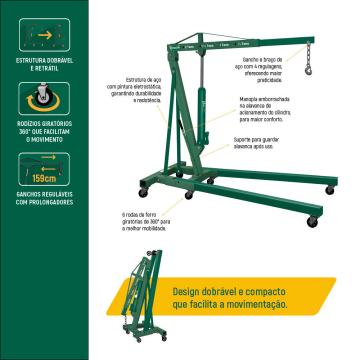 Com um design compacto, facilita seu armazenamento e movimentação, apresentando 6 rodas de ferro com giro de 360° promovendo uma melhor mobilidade. Equipado com um gancho e braço prolongador ajustável com 4 regulagens permitindo içar objetos grandes ou pequenos de forma prática e segura.