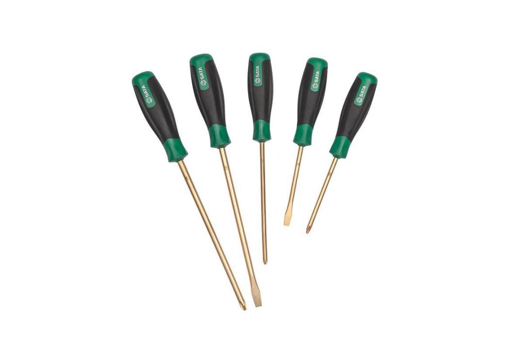 Segura, confiável e durável: conheça o Jogo de Chaves Retas 5 peças Antifaíscante SATA, fabricada em cobre-berílio e projetada para o uso em ambientes exigentes. Sua composição é em liga de cobre-berílio, opção ideal para trabalhar em segurança em ambientes inflamáveis prevenindo faíscas que podem causar explosões, além de oferecer uma durabilidade maior em comparação com as ferramentas convencionais criando resistência natural a corrosão. Por ser não magnética, é ideal e seguro o uso onde a interferência magnética pode causar riscos ou danos.Garanta a segurança da operação anulando os riscos de explosões em locais de risco, com as ferramentas antifaiscantes SATA!