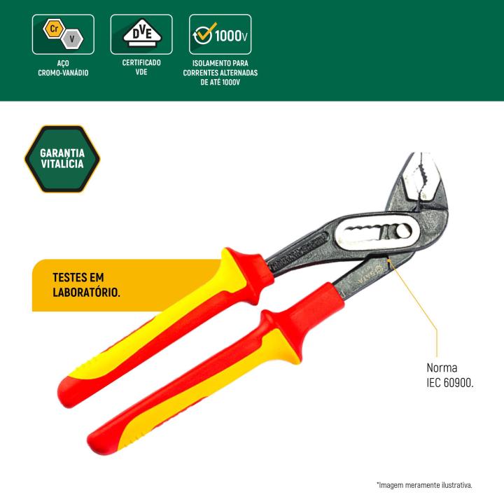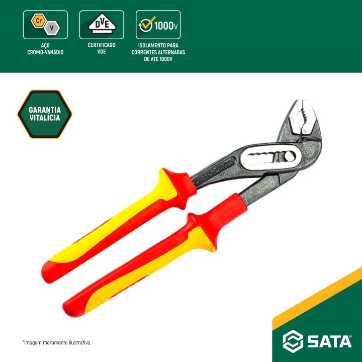 Elevamos o nível de segurança ao máximo, Alicate Bomba d’Água VDE 10 polegadas SATA – ST70145 com garantia de certificação IEC 60900, altamente recomendado para profissionais que trabalham em áreas de alta tensão , como redes energizadas, instalações industriais e hidráulicas, sendo usado para torque, instalação de bombas d'água, registros e boias registros e boias, instalação de conectores tipo cunha e para aperto de parafusos e porcas no geral, sendo indispensável para profissionais que prezem pela segurança para executar suas operações com tranquilidade.Dupla camada de proteção, oferece mais segurança ao usuário e permite que o desgaste da ferramenta seja identificado previamente, sendo assim, quando a segunda capa protetora estiver visível, a ferramenta deve ser substituída por uma nova.Fabricado em Aço-Cromo Vanádio de alta qualidade e seus dentes angulados e temperados proporcionam maior resistência e aperto, aumentando a produtividade e prolongando a vida-útil da ferramenta.