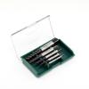 Utilizado para remoção de parafusos quebrados e prisioneiros com rosca. Indispensável para profissionais mecanicos, seu uso é bem simples, basta com uma pulsão fazer um furo inicial na cabeça do parafuso, fazer um furo com uma broca e utilizar o extrator com o auxílio de uma parafusadeira sendo o mesmo da mesma bitola que a broca.A função deste jogo extrator de parafusos, é soltar, extrair, remover ou trocar o prisioneiro, que por ventura sofra uma avaria, quebrando ou perdendo a rosca externa. Jogo com 5 peças nas medidas de Nº 1 x 54mm, indicado para extração de parafusos das medidas M3-M6 e 1/8"-1/4"; Nº 2 x 58mm, indicado para extração de parafusos das medidas M6-M8 e 1/4"-5/16"; Nº 3 x 61mm, indicado para extração de parafusos das medidas M8-M10 e 5/16"-3/8"; Nº 4 x 75mm, indicado para extração de parafusos das medidas M10-M14 e 3/8"-9/16"; Nº 5 x 84mm, indicado para extração de parafusos das medidas M14-M18 e 9/16"-3/4"".
