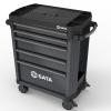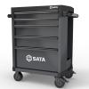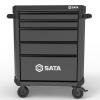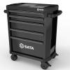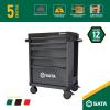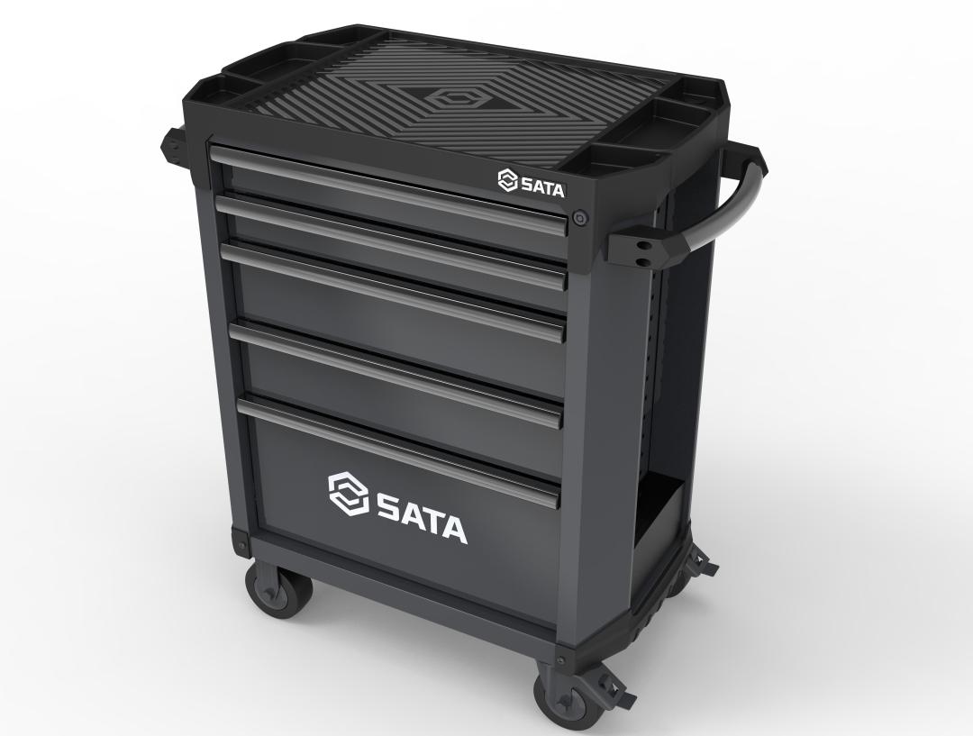 Apresentando o novo portfólio de Carros para Ferramentas Profissional SATA! Agora, com três opções de cores vibrantes para se integrarem perfeitamente ao layout da oficina, além de possuir uma gama de acessórios* que elevam a versatilidade e a otimização durante o trabalho.O Carro para Ferramentas Profissional com 5 gavetas preto SATA - ST95112G-B possui um mecanismo anti-tombamento premium, impedindo a abertura simuntânea das gavetas evitando a queda, proporcionando segurança e praticidade ao usuário. Feito em aço reforçado de 1,2mm, suporta até 800kg de carga estática com capacidade de 45kg por gaveta, e sua pintura eletroestática garante sua resistência e durabilidade. Os rodízios são reforçados com rodas de polipropileno, sendo duas rodas fixas e duas giratórias 360º com freios superiores de alta performance.Suas laterais conta com painel perfurado para personalização com acessórios diversos*, sendo inclusos dois porta-garrafas.Suas gavetas são equipadas com corrediças de rolamento de 45mm, garantindo estabilidade e prevenindo que as gavetas abram durante o deslocamento do carrinho, além de serem forradas com EVA de 2mm, para proteger as ferramentas de arranhões. O tampo resistente de ABS inclui bandejas para peças pequenas e bordas anti-queda, proporcionando organização e segurança ao usuário.