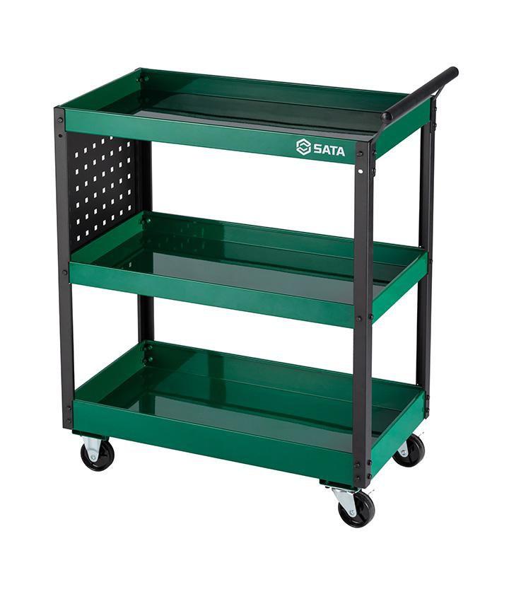 Chegou o Carro para Ferramentas de 3 Níveis SATA - ST95222B pronto para elevar a produtividade e versatilidade dos mecânicos automotivos e industriais. Suas laterais contam com painéis perfurados para personalização com acessórios diversos.O carrinho possui uma estrutura robusta, feita inteiramente de chapas de aço de 1,2 mm, proporcionando máxima resistência e suportando até 80 kg de carga estática. Sua pintura eletroestática garante durabilidade, assegurando uma vida útil prolongada.Seus rodízios de 3” contam com rodas em Poliuretano, sendo duas rodas fixas e duas rodas giratórias de 360º com freios superiores, suportando serviços mais pesados com mais segurança e mobilidade.Possui três bandejas, garantindo a proteção das ferramentas contra quedas durante o transporte. Também possui um puxador ergonômico que facilita o transporte.