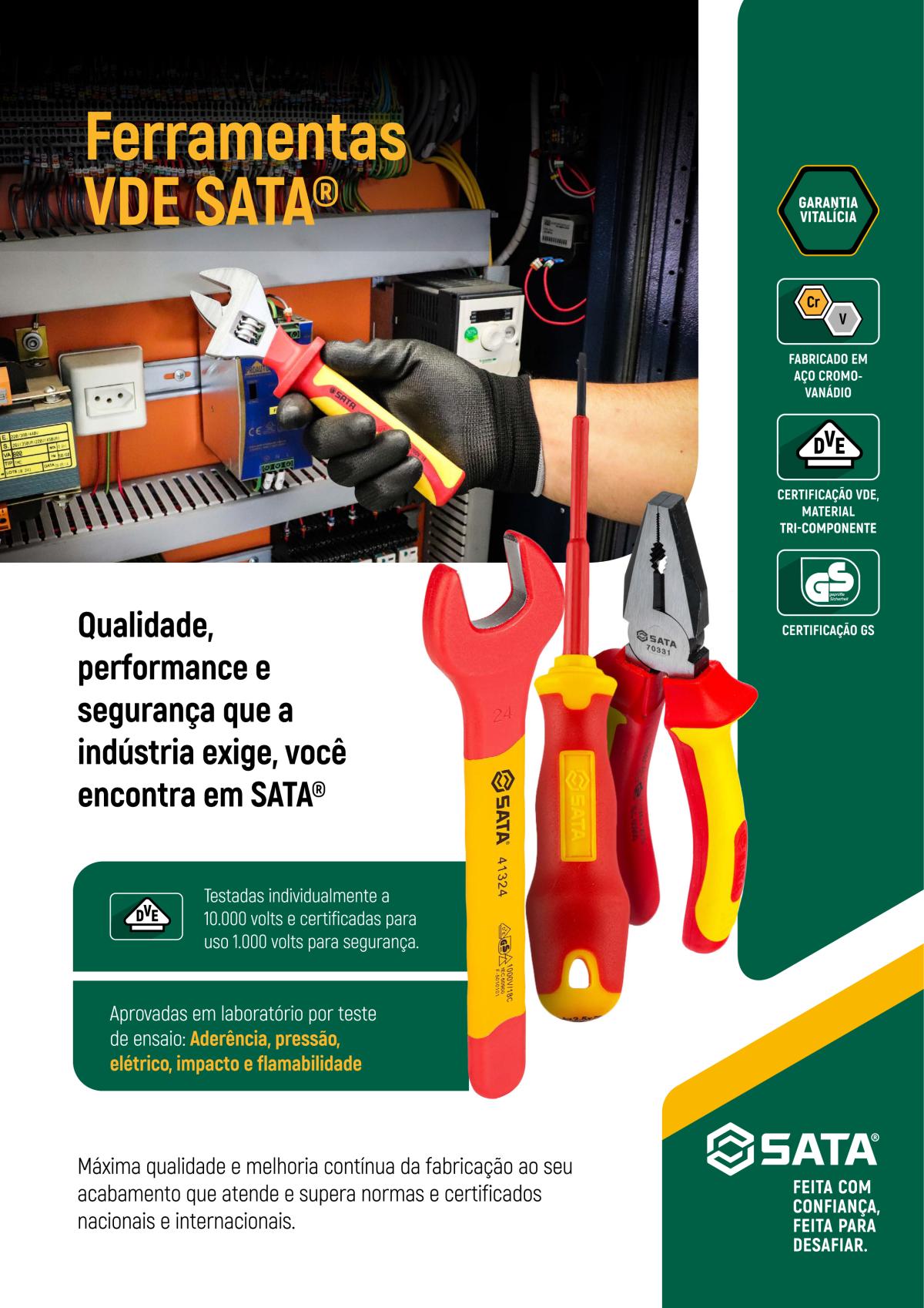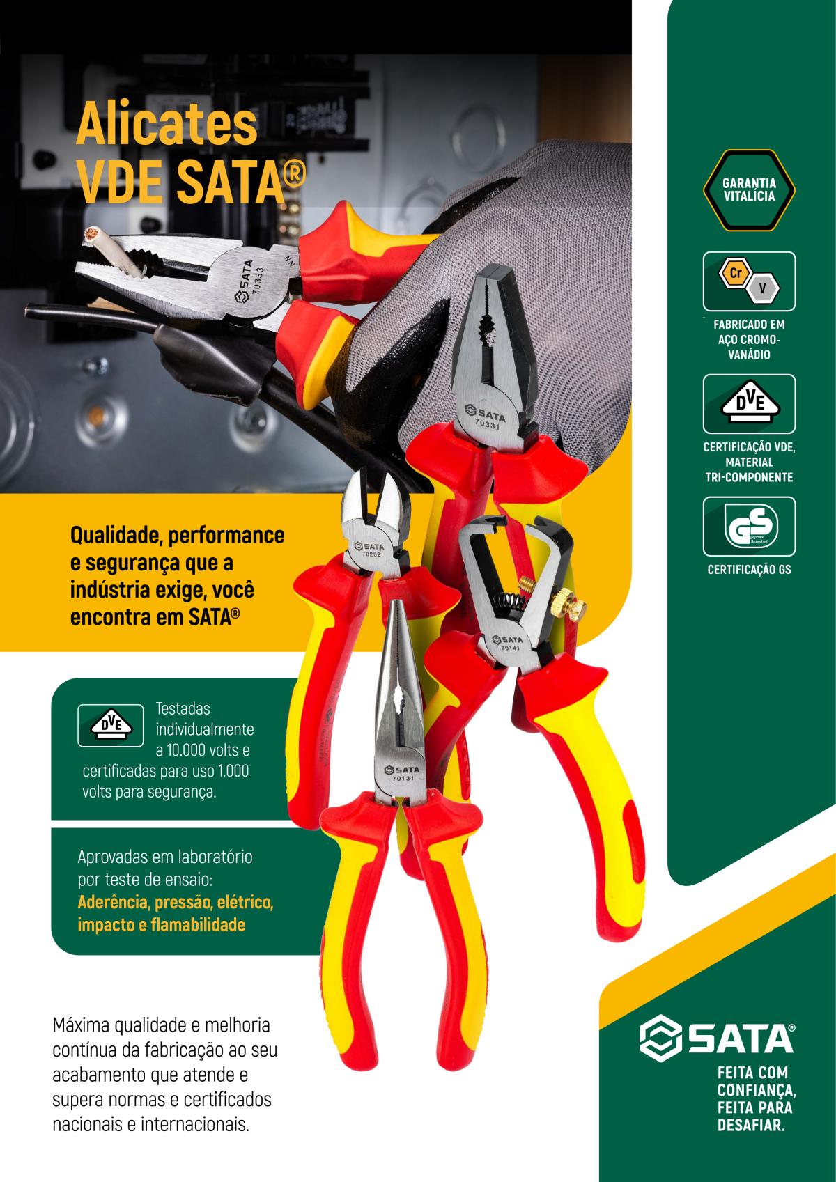 Fabricação em aço cromo-vanádio, certificação VDE com material tri-componente e certificação GS que possibilita garantia vitalícia.