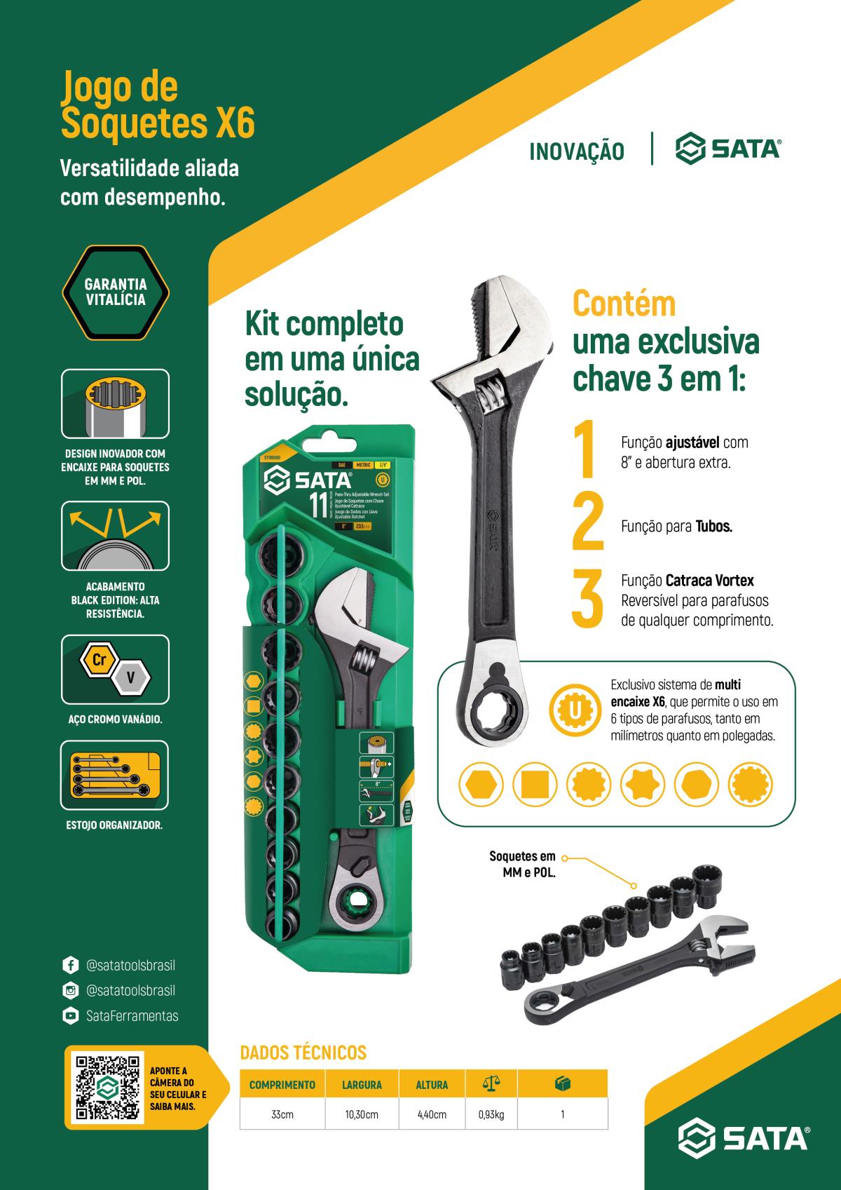 Exclusivo sistema de multi encaixe X6 que permite o uso em 6 tipos de parafusos, tanto em milímetros quanto em polegadas, com acabamento em Black Edition que traz alta resistência para a ferramenta.