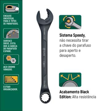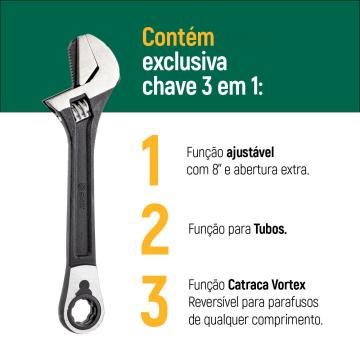 Versatilidade aliada com desempenho e menos esforço. Duas opções de jogos, sendo uma com as chaves que possuem o sistema speedy e outro com os soquetes e chave ajustável com função catraca vortex.
